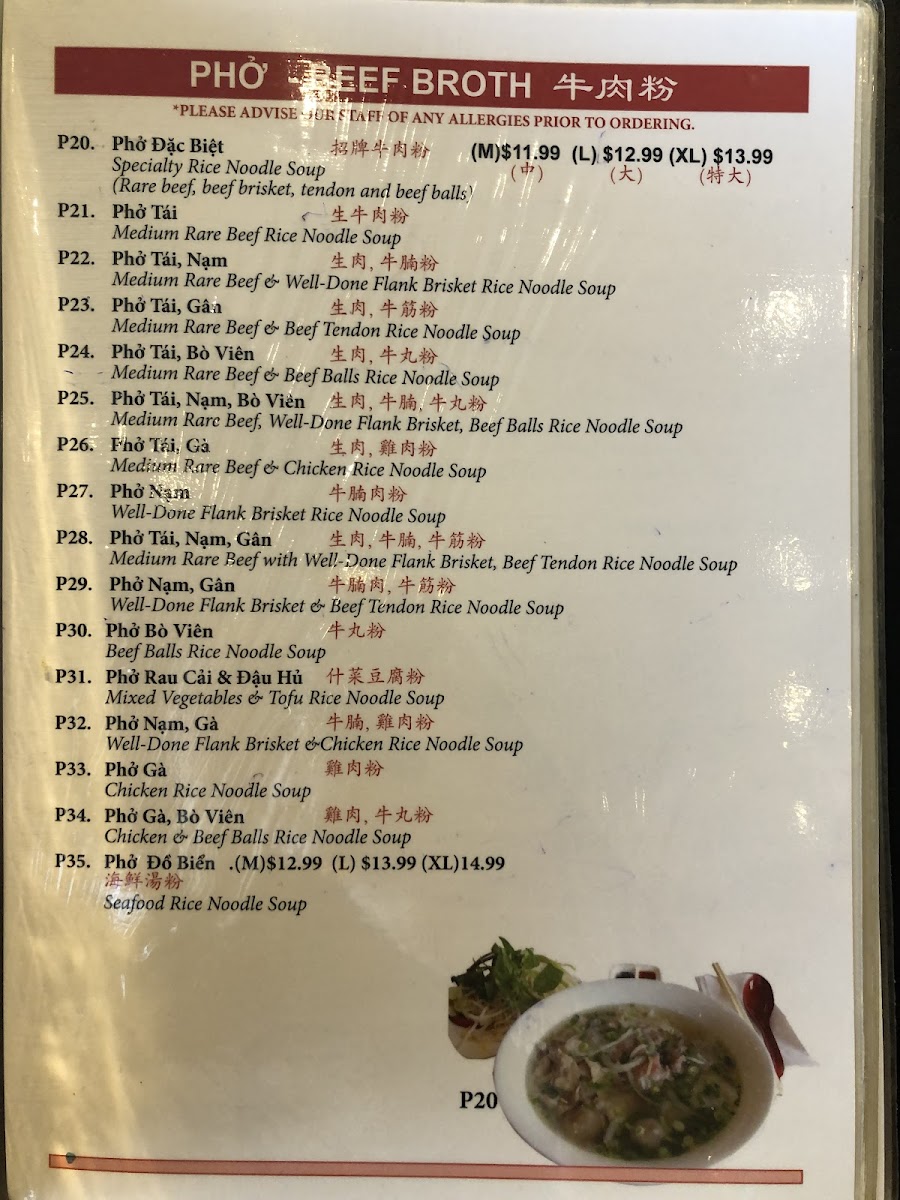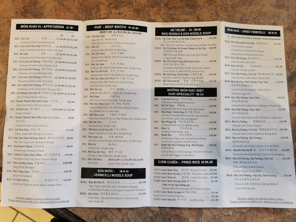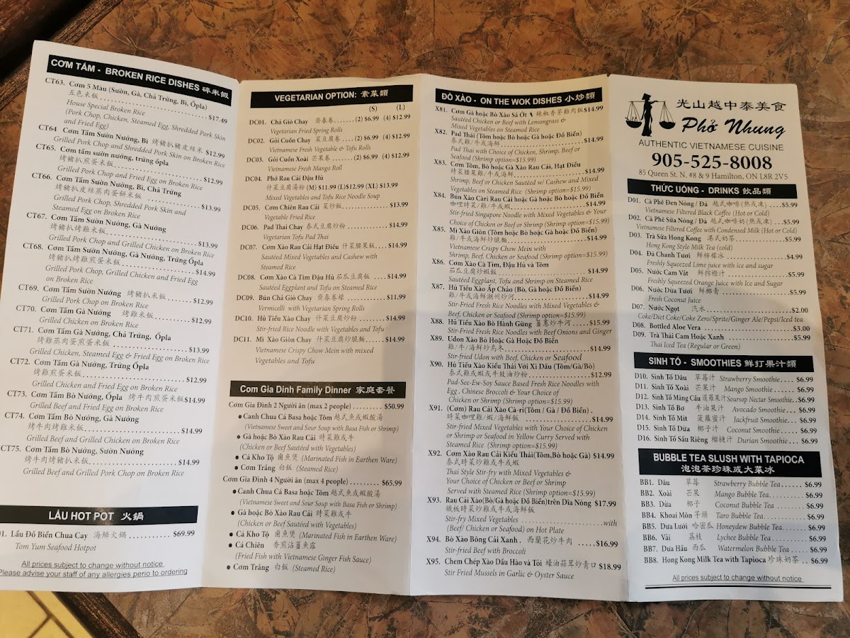 As a reviewer wrapping up the menu experience at Pho Nhung, I find the offering to be a well-rounded celebration of Vietnamese comfort food with thoughtful variety across categories. The soup noodle section sets a strong foundation with classics like Bun Bo Hue and Bun Rieu, delivering depth and authenticity. Rice plates are equally satisfying, especially signature combinations such as Pho Nhung Com 5 Mau Suon Ga Cha Trung Bi Opla, Grilled Pork Chop And Shredded Pork Skin On Broken Rice, Grilled Pork Chop And Fried Egg On Broken Rice, Grilled Pork Chop Shredded Pork Skin And Steamed Egg On Broken Rice, and Grilled Pork Chop And Grilled Chicken On Broken Rice, which balance grilled flavors with comforting textures. For lighter bites, the rolls shine-Vegetarian Spring Rolls 2, Vegetarian Spring Rolls 4, Vietnamese Fresh Vegetable And Tofu Roll 2, Fresh Vegetable Tofu Rolls 4, and Vietnamese Fresh Mango Roll 2 offer freshness and contrast. Stir-fry lovers can rely on bold options like Com Ga Xao Sa Ot, Com Bo Xao Sa Ot, Pad Thai With Chicken, Pad Thai With Beef, and Pad Thai With Shrimp, while fried rice staples-Shrimp Fried Rice, Bbq Pork Fried Rice, Chicken Fried Rice, Shrimp Bbq Pork Sausage Fried Rice, and Salted Fish With Chicken Fried Rice-add hearty appeal. The special section elevates the menu with Vietnamese Shaking Beef With Steamed Rice, Herbal Egg Noodle Soup Of Stewed Fried Duck, and Bun Mam Vinh Chau. Snacks and beef noodle soups, including Vietnamese Pork Fried Spring Rolls 2, Vietnamese Pork Fried Spring Rolls 4, Vietnamese Fresh Summer Roll Pork Shrimp 2, Vietnamese Fresh Summer Roll Pork Shrimp 4, Vietnamese Fresh Shredded Pork Skin Roll 2, plus pho favorites like Special Rice Noodle Soup, Medium Rare Beef Rice Noodle Soup, Medium Rare Beef Welldone Flank Brisket Rice Noodle Soup, Medium Rare Beef Beef Tendon Rice Noodle Soup, and Medium Rare Beef Beef Balls Rice Noodle Soup, round things out. Breakfast vermicelli bowls, flour noodle soups, refreshing smoothies, classic drinks, bubble teas, and the New Banh Mi Sandwich lineup complete a menu that feels comprehensive and satisfying-an inviting conclusion to a thoughtful dining experience at Pho Nhung.